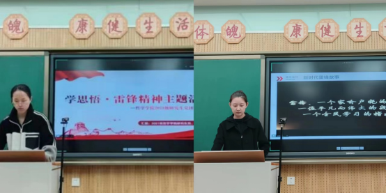第二环节,党支部第四党小组吴小蓝通过对雷锋成长故事的讲述及雷锋精神的解读,让同学们更进一步了解了雷锋的伟大。第三环节,团支部组织委员李晓珍带领大家进行雷锋精神的视频学习,以及深刻解读雷锋精神对于时代及青年的重要意义。